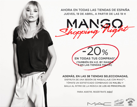Este jueves, 19 de abril, es el día elegido por la empresa para celebrar su Shopping Night, día en el que a partir de las siete de la tarde se podrán adquirir prendas y complementos con un 20% de descuento (también online). Además, en las tiendas físicas de la empresa -incluidas las H.E. y las Touch- se podrá tomar un combinado Malibú, disfrutar de una sesión de maquillaje MAC y bailar al ritmo de la música de los 40 Principales, según anuncian.