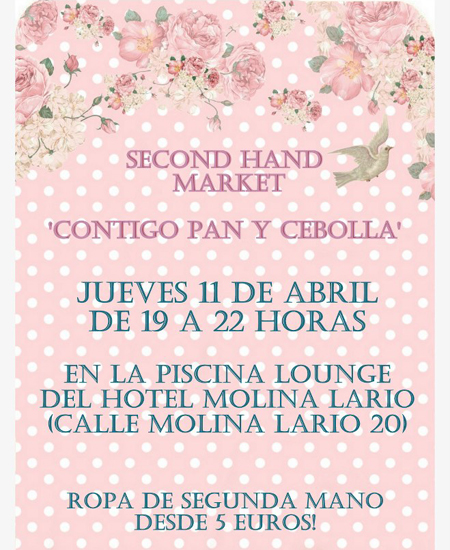 Es el mismo mercadillo de siempre pero en un sitio con mejores vistas y más espacioso. La habitación de Kate pone en marcha este jueves, 11 de abril, una nueva edición de su mercadillo de segunda mano ‘Contigo pan y cebolla’. Pero, a diferencia de otras ocasiones, no será en su local de la calle Mártires sino en la terraza del hotel Molina Lario… También en el Centro pero junto a una piscina, al aire libre, que para eso estamos en primavera, y con unas vistas privilegiadas de Málaga.