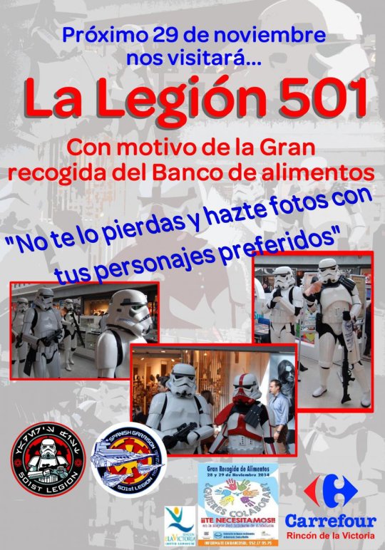 De este modo, la Legión 501 Spanish Garrison colaborará en la gran iniciativa a favor de los más necesitados que este viernes y sábado se realiza en Málaga asistiendo al centro comercial rinconero el sábado de 11.30 a 14 horas y de 17.30 a 20. ¿Te lo vas a perder?