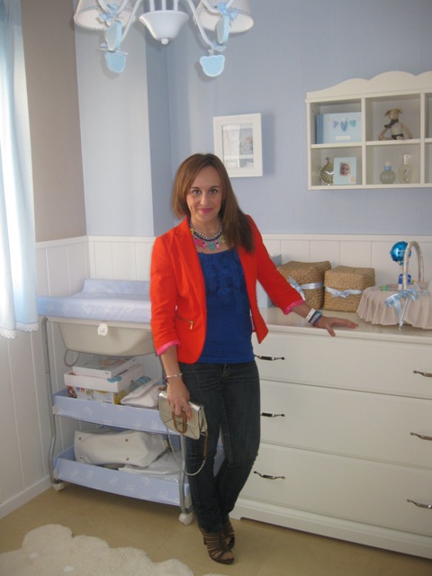 A continuación os dejo el look que elegí este domingo para dar un paseo al solecito por las playas de El Palo con Alejandro, desde hace siete meses el rey de mi casa. Como vereis, el collar de calaveras es el protagonista absoluto sobre el que gira un estilismo colorista y alegre que combina varios de los tonos estrella de la primavera (el azul klein y el naranja chillón). Para ir cómoda con Alejandro opté por un bolso plateado pequeño tipo bandolera que compré en Sfera y al que estoy sacando muchísimo partido.
