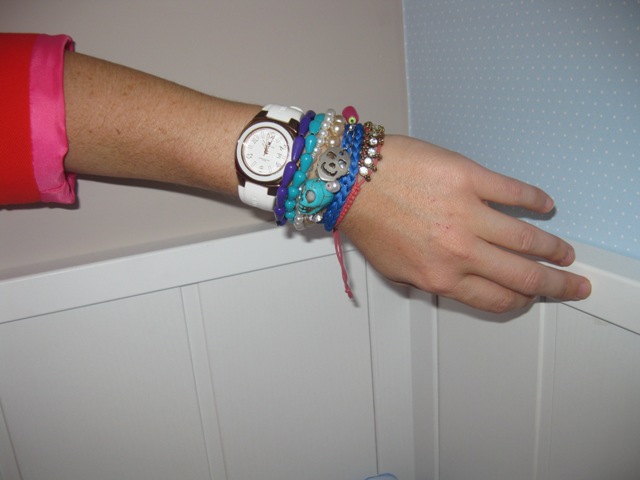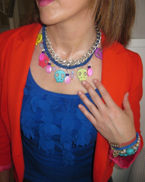 Os explico: los vaqueros son de Mango, el modelo entubado que en mi caso es con diferencia el que mejor me sienta y con el que me encuentro más cómoda. Las sandalias de multitiras de taconazo son de Zara del año pasado y le estoy sacando muchísmo partido. La camiseta azul klein es de Mango, de esta colección, y me gusta por el tejido super agradable que tiene y por sus jaretas. La chaqueta, de Zara de la temporada de primavera de 2011, es la favorita de mi colección (para mi esta prenda es un básico y tengo debilidad por ellas). Me encanta su tono (llamativo y super favorecedor), la vuelta rosa frambuesa de la manga, sus cremalleras doradas y el botón en azul klein. Pero sin duda, la pieza estrella es el collar de calaveras de colores, de la firma malagueña No me llames muñeca, que me parece ideal para combinar este verano con los colores de moda. las pulseras también son de No me llames muñeca.