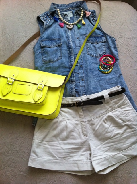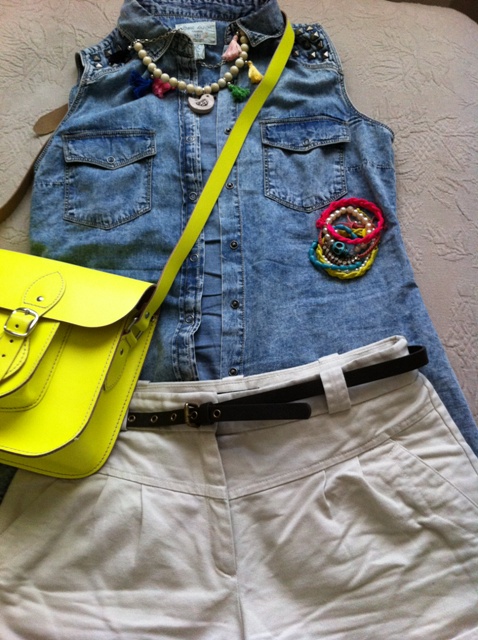 LOOK 1: SHORT BEIGE+CAMISA VAQUERA CON TACHUELAS+COMPLEMENTOS FLUOR