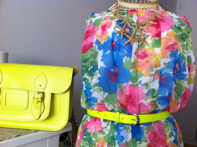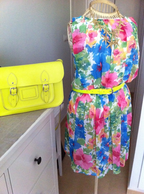 LOOK 2: VESTIDO DE PRINT FLORAL+CINTURÓN FLUOR+COLLAR DORADO