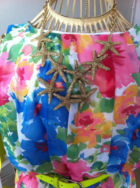 Este conjunto es enterito de Blanco. Dio la casualidad que hace un par de semanas pillé la oferta que lanzan de Night Shopping, con descuentos del 25% a partir de las siete de la tarde…y como cualquier excusa es buena, me animé a hacerme con algunas cositas a las que tenía echado el ojo. Entre ellas este vestido de estampado floral (otro de los imprescindibles de esta primavera-verano), que me encantó nada más verlo en la percha por su alegre colorido y porque tiene un corte super favorecedor. El maxi collar de estrellas de mar dorado fue otro flechazo. Como ya os he comentado, se llevan muchísimo los complementos de inspiración marina y me apetecía tener uno…y este era perfecto. El cinturón lo compré pensando en el bolso (aún no lo tenía pero ya soñaba con el jeje) y puestos a arriesgar, me gusta la mezcla con el vestido. Creo que hacen buena pareja, así que los mezclaré más de una vez.