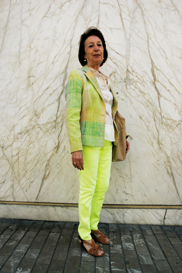 Lo confieso: es una de las tendencias que más me convence de este verano (ya os enseñé mi bolso amarillo chillón de Stella Rittwagen ideal para no pasar desapercibida). Los colores flúor (que se encuentran entre los reyes de la paleta esta temporada) son estridentes, sí, pero también son alegres y divertidos (ya tendremos tiempo de aburrirnos en invierno con los tierra, los negros, los marrones, los burdeos o los grises). Nuestra protagonista de hoy me gusta porque es atrevida y porque demuestra con su estilismo que la moda, como el amor, no entiende de edades. A sus 66 años, el pasado martes María Gonzalvez no dudó en enfundarse unos pantalones en amarillo fluorescente para acudir a calle Larios a participar en la cuestación a favor de la Asociación Española contra el Cáncer. Con el glamour que le veis en estas fotos paseó la famosa hucha por el Centro en su intento por despertar la solidaridad de los malagueños. “Me gusta seguir las tendencias pero siempre apostando por la comodidad”, nos confesó a las puertas de la zapatería Nicolás. “Siempre he sido atrevida, menos con los escotes que ya no me veo con ellos”, añadió esta jubilada super fashionista. Me gustó su chaqueta de Adolfo Domínguez, en tonos verde y lima que combina a la perfección con sus pantalones y le da un punto bastante sofisticado.