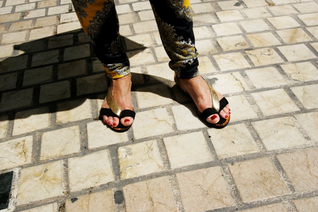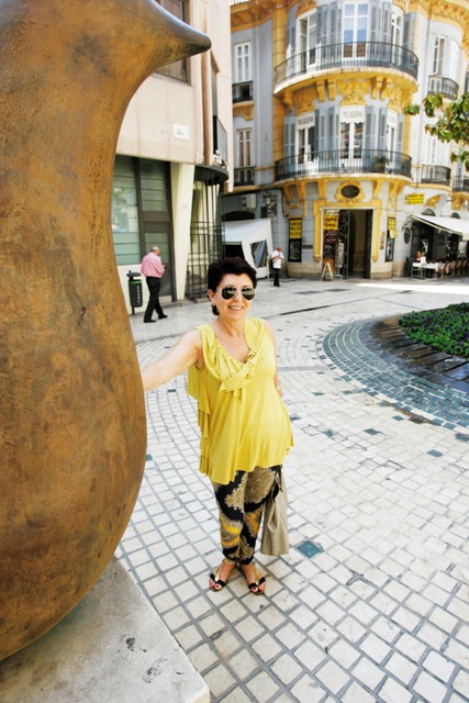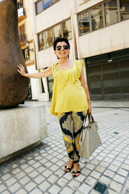 ¡Buenas! Ya estamos a miércoles, casi en el ecuador de la semana. Y seguimos fichando los ‘look’ de la calle. El protagonista del estilismo de hoy es el mostaza, un tono más otoñal y, por ende, menos visto esta primavera pero que a mi personalmente me gusta bastante combinado, por ejemplo, con negro y dorado, como nos propone la protagonista del post de hoy: Carmen Vera, una simpática ama de casa de 56 años amante de la moda confesa que asegura tener su “estilo propio”. Su ‘outfit’, dice, gira en torno a un bonito bolso de piel de Furla en beige con acabado satinado y destellos metalizados. Pero no es el único que acapara las miradas. Su bolso compite con su pantalón de estampado pañuelo, que como ya hemos comentado en reiteradas ocasiones es uno de los imprescindibles de este verano. Carmen lo combina con una favorecedora camiseta de volantes (también de Opalo) con un precioso corte en la espalda. Me gustaron también bastante sus sandalias, en negro y oro, pero he de decir que hoy me las he probado en Zara y me han parecido incómodas porque la tira de en medio aprieta mucho en los dedos. Os dejo con Carmen. ¡Ah, y recordad: mañana jueves por la mañana estaremos en calle Larios haciendo la sesión de fotos de esta semana! Os espero a partir de las 10.45.