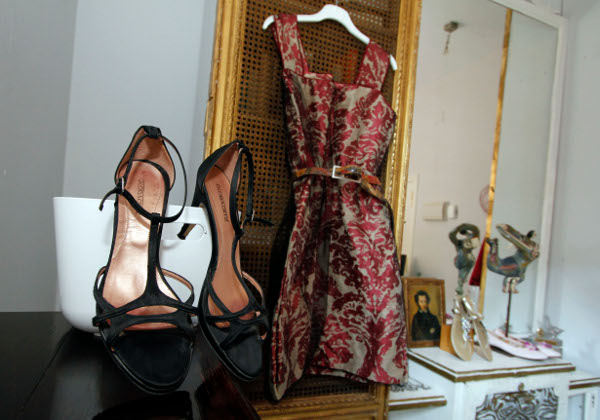 Con la crisis como telón de fondo, De la Rosa propone para este verano prendas de fondo de armario, adquisiciones ‘low cost’ en rebajas y «volver a recurrir a la costurera». Ella misma predica con el ejemplo con el ‘look’ con el que posa para este reportaje y que centra su apuesta para un ‘outfit’ de diario: camisa verde militar «la tengo desde hace 20 años», falda de la costurera Inés Durán hecha de un retal de tela de Ikea y cinturón de cuero y apliques plata, un viejo regalo de un amigo. «Para el día prefiero los tonos tierra y estampados discretos», indica. De Inés Durán (cuyo nombre comercial es O’Jara en un guiño a la princesa Escarlata que se hizo un vestido de unas cortinas) es también el traje color champgne con brocados burdeos que propone para ir a cenar. Lo ciñe con un mini cinturón y lo acompaña de unos taconazos negros de Gloria Ortiz. «Está hecho de un trozo de tapicería que tenía por casa y el resultado es ideal. Y lo mejor su precio: 40 euros».