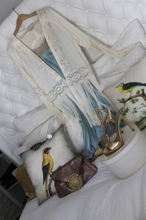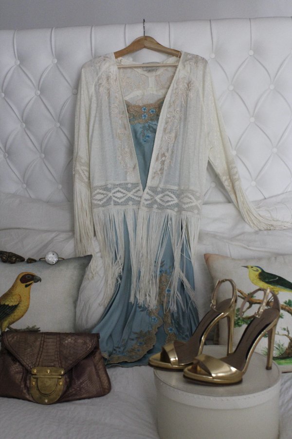 LOOK PARA UN EVENTO: Vestido lencero+kimono con flecos+zapatos de salón dorados
