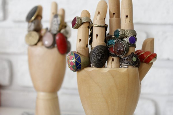 En las fotos de arriba muestra una parte de su colección de anillos. Los suele llevar de su marca, vintage o traídos de alguno de sus múltiples viajes. «Adoro los étnicos de la India o Afganistán». Le gustan XL y suele llevar varios juntos.