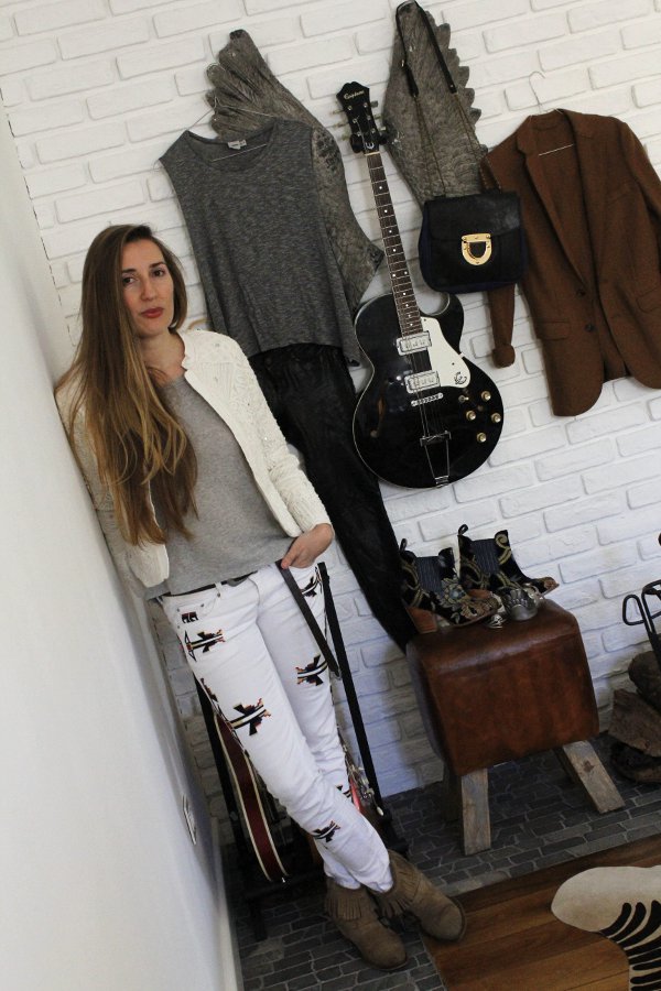 Su propuesta de diario: camiseta en blanco roto con aplicación en el hombro traída de Tailandia, camisa vaquera Levis de hombre adquirida en el mercadillo de segunda mano de Fuengirola (“me gusta usarla abierta tipo abriguito”), abrigo de pelo tipo patchwork también vintage traído de París, vaqueros blancos de Zara deshilachados (Susana nos confiesa que siempre persigue el efecto ropa usada y gastada, “cuantas más puestas tiene una prenda más me gusta”, advierte) y bolso y botines de cordones de Su-Shi. Preguntada por lo que significa la moda para ella, la diseñadora recalca la importancia que tiene en su vida: “Es una parte muy importante, es mi trabajo y mi hobbie a la vez, está y ha estado siempre presente desde que era una niña ya que me viene de familia ya que mi madre tenía una empresa de servicios ligada al sector”, nos contó.