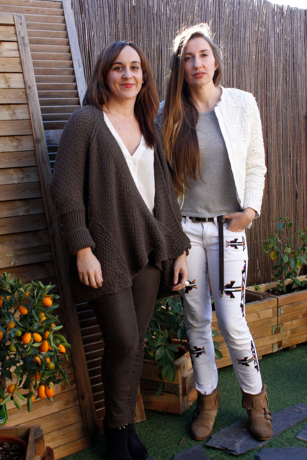 Por último, os dejo una foto mia con Susana en la preciosa terraza de su piso, en la barriada de la Trinidad. Ella lleva pantalones de print étnico Isabel Marant, camiseta básica gris de Iro, chaqueta blanca de Zara con bordados e incrustaciones de pequeños espejos (muy en su estilo boho-chic) y cinturón y botas Su.-Shi. En mi caso, me decanté para la ocasión por camisa blanca de Zara, cárdigan verde militar de Bershka y pantalones que simulan la piel de serpiente de la nueva colección de Zara (son gustosísimos, muy recomendables) y botines negros con tachuelas de Pull&Bear.