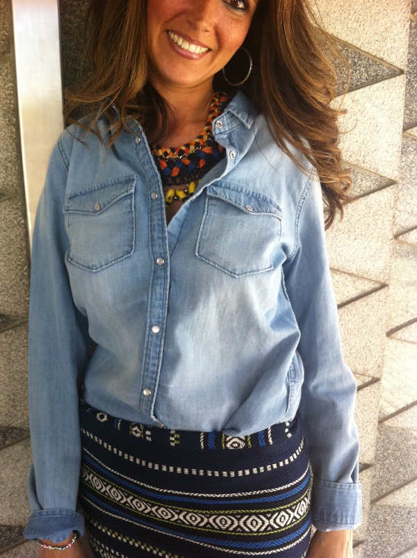 A estas alturas de la temporada no hace falta que os diga que si hay una tendencia que está arrasando sobre la pasarela urbana de Málaga esa es la inspiración étnica, convertida estos días en una de las grandes protagonistas del street style. Triunfan el estampado navajo y demás print tribales, la mezcla de colores ácidos, los collares y complementos de pedrería en formato XL…Nuestra protagonista de hoy adapta con maestría esta moda con un look impecable ideal para cualquier momento del día. Inmaculada Paniagua, una comercial de 36 años, construye su outfit en torno a una bonita falda tapicera (imprescindible esta primavera) en tonos azules (de Easy Wear, El Corte Inglés) que combina con acierto con una camisa vaquera (un básico de fondo de armario versátil donde los haya). Remata el estilismo con un maxi collar de hilos trenzados y cuentas (muy favorecedor) de Adolfo Domínguez, un bolso de print navajo de Sfera (me ha enamorado) y unos botines de cordones con los dedos al aire (muy chulos) de Caramelo. ¿El resultado? Estiloso, sofisticado y con un punto juvenil. ¡Me gusta! ¿Y a vosotras? ¡Hasta mañana! Os espero en Twitter: @almunogues ¡Que paséis buena tarde!