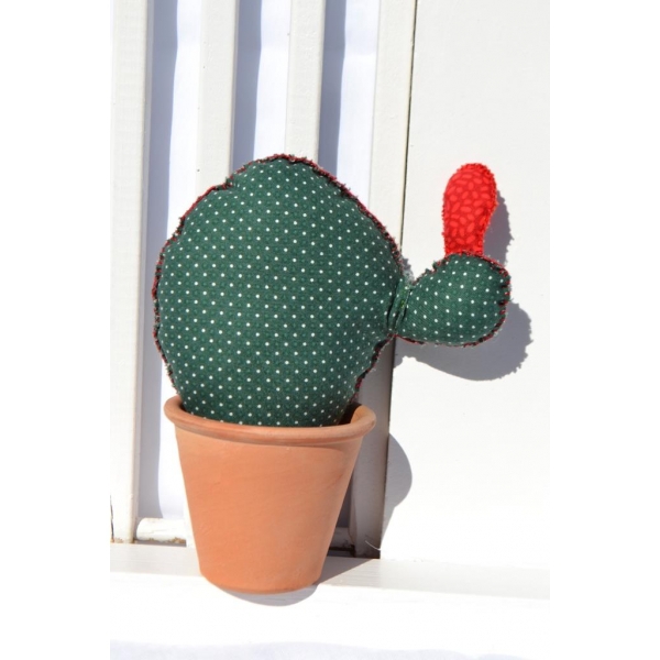 Cactus de tela de algodon 100% de patchwork y tiesto es de terracota. La altura del cactus es de aproximadamente 20cm. Ideal para decorar algún rincón de la casa. Elaborado de forma artesanal por la firma Marak.