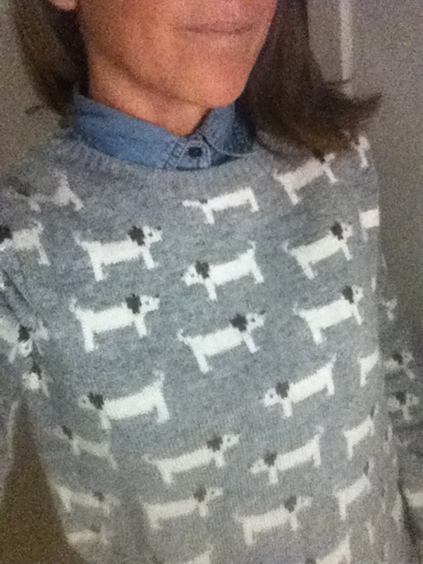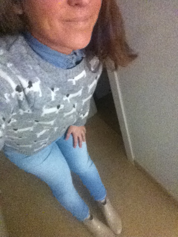 Los he combinado con vaqueros entubados tobilleros en celestón (Zara), camisa vaquera y jersey de perritos de Oysho (una de mis adquisiciones rebajiles, me encantaaaa).