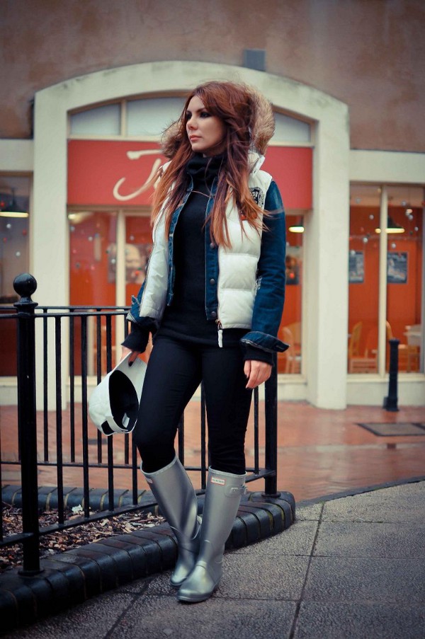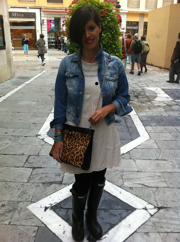 May Fernández, con Hunter negras (muy chulas con vestido blanco lencero, chaqueta vaquera y bandolera de print animal).