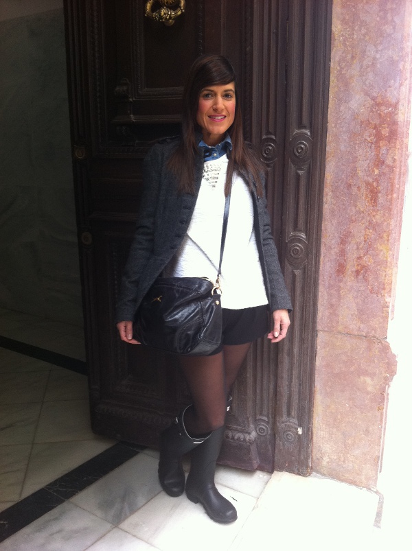 Marina Andrés marida sus Hunter con shorts, camisa y jersey joya.
