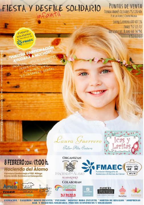 La Fiesta tendrá lugar en la carpa de La Hacienda del Álamo con patrocinio del Alabardero Catering. ¿Cómo comprar las entradas? Existen distintas vías: bien por teléfono (al 635 338 997, al 629 762 142 o al de la Hacienda el Álamo, 952 65 26 53) o bien adquirirlas en la tienda de Andrés Olivares en la plaza de las Flores o en el atelier de Laura Guerrero situado en calle Arenal nº 9, 3º, oficina 16. El precio es de 6 euros por adulto y 3 euros por niño (que va a parar íntegramente a la Fundación de Enfermos de Cáncer). En el caso de las familias numerosas el precio por niño será de 1 euro. La moda se viste con sus mejores galas de solidaridad…¡y toca apoyarla! ¡Allí estaré! ¿Y vosotros?