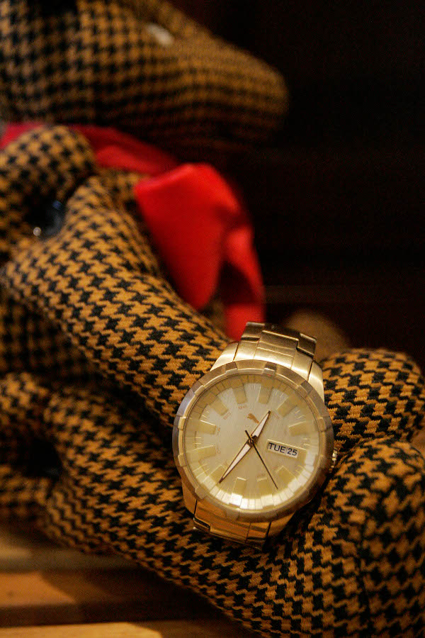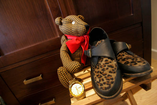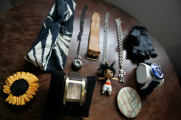 Relojes de Esprit y Swatch, broches de la Fundación Vicente Ferrer (el de Girasol) y traído de Japón. Pulsera Louis Vuitton y colgantes de Paul Frank y hecho por un amigo (el de Aladín, su personaje favorito de Disney, “Soy muy friki de Aladín y me lo regaló”, bromea).