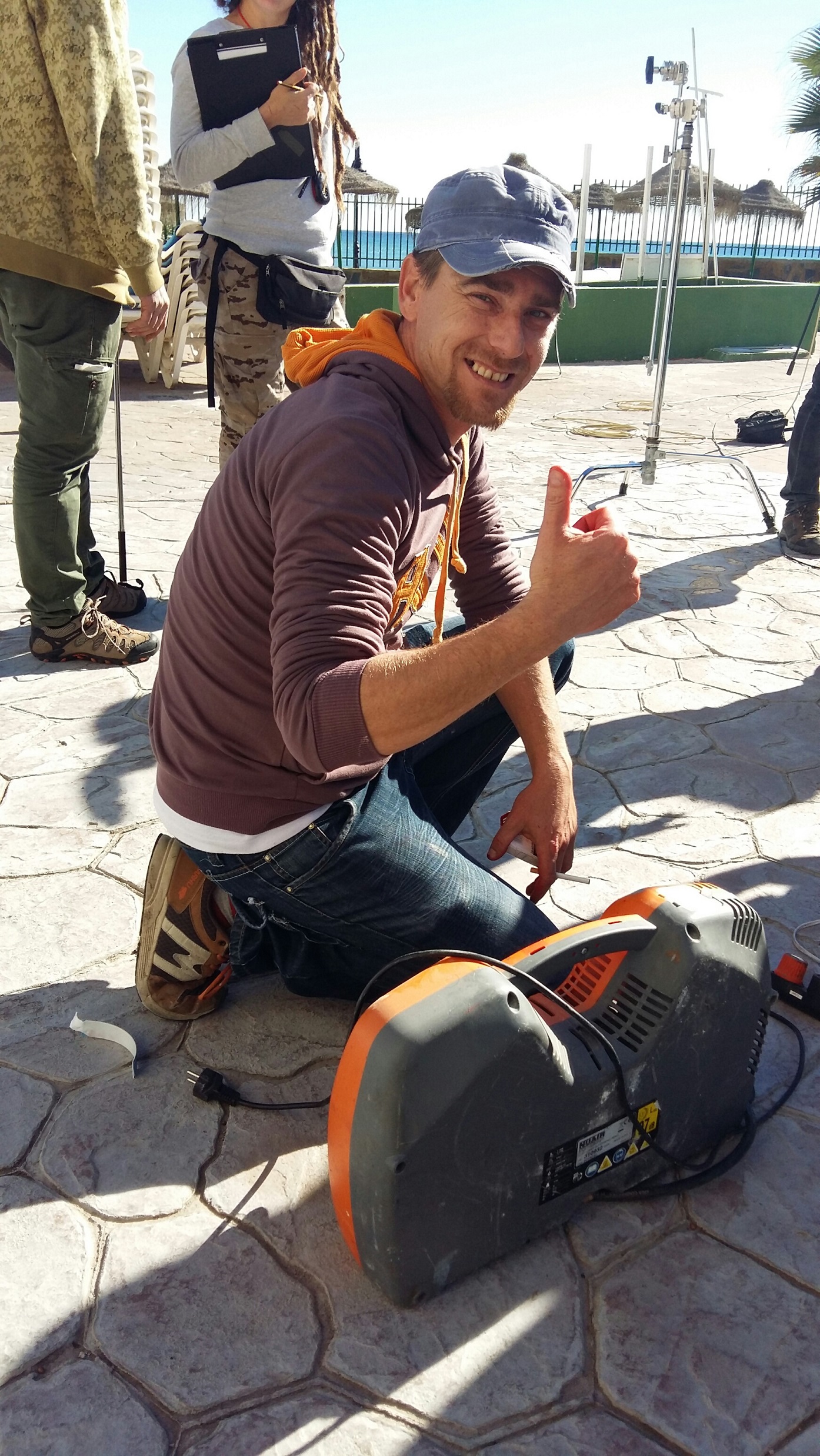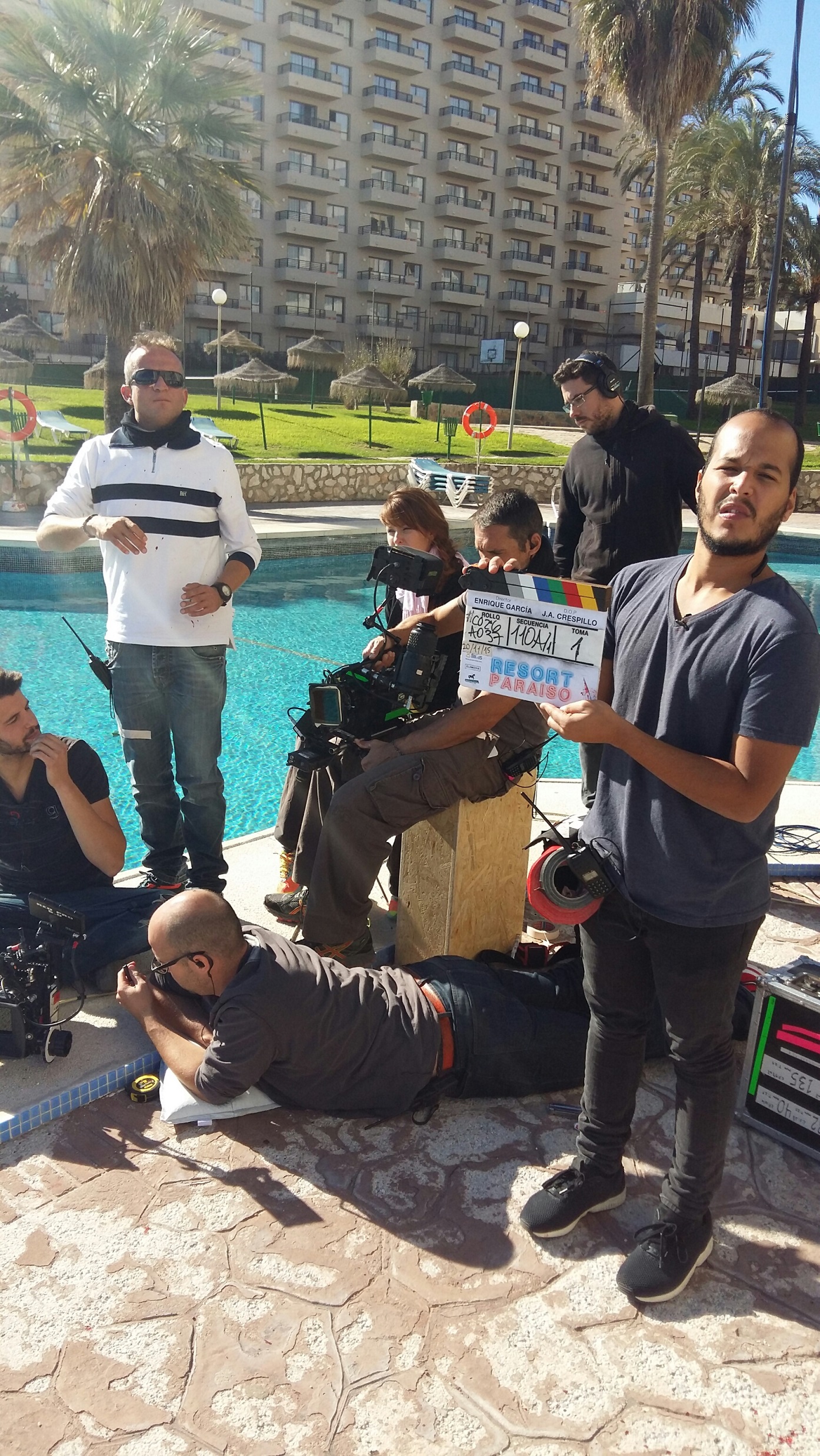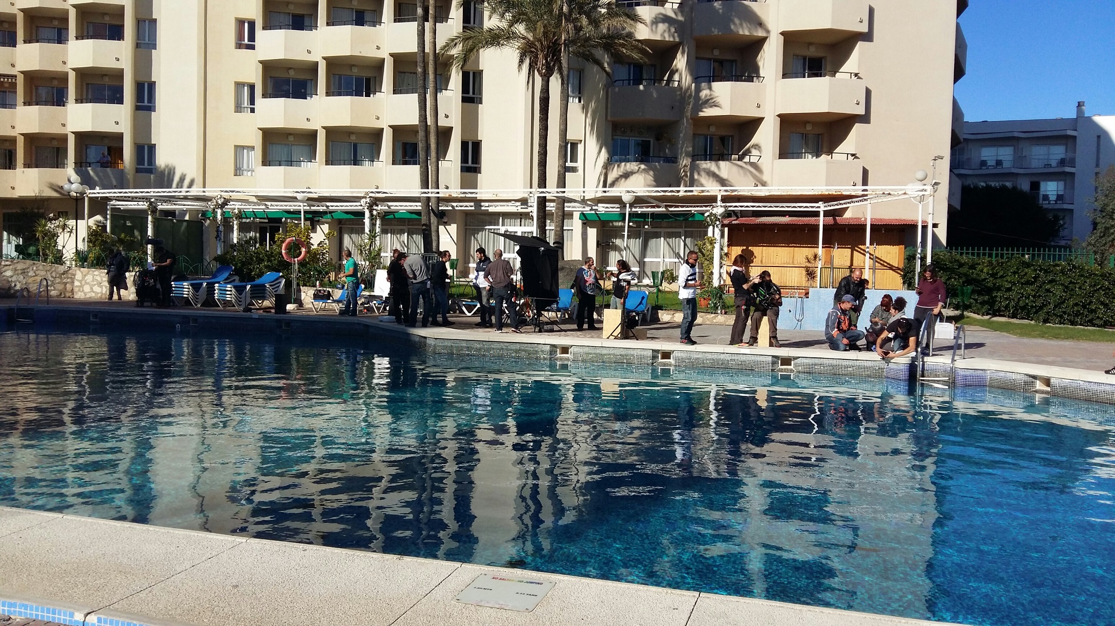 Si ayer empezamos con el rock and roll, hoy hemos empezado con los primeros guitarreos y solos de batería del heavy metal. El mayor foco del mundo (el Lorenzo de la Costa del Sol), una brisa que cortaba como cuchillos hasta las 12:00 de la tarde y que se ha convertido en calina achicharrante a partir de las horas más altas del día, y una complicada coreografía en plena piscina, han convertido el rodaje en exteriores en un enjambre de técnicos, fx, intérpretes y curiosos.