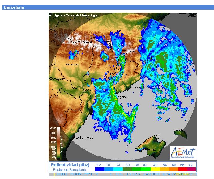 Pero lo mas destacado del domingo fue, las tormentas que se dieron en la Costa Catalana. En esta imagen del radar de lluvias y de rayos de la aemet lo dice todo.