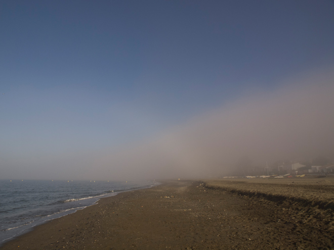 El domingo amaneció Torre de Benagalbón con una rociada impresionante. Mirando hacia el mar cuando era las nueve de la mañana , vi que entraba niebla. Asi que baje para la playa que la tengo andando a tan solo unos metros. La Boira se adueño de la playa, dejando unas imágenes muy bonitas. La superficie del agua del mar tiene que estar caliente, por este motivo cuando entran brisas de sur sureste frias provocan esta nieblas.