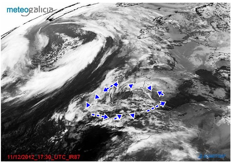 En esta imagen del satelite eumetsat, se ven las nubes altas y medias que están llegando a Andalucía. Estas serán las que puedan traer esos chubascos.