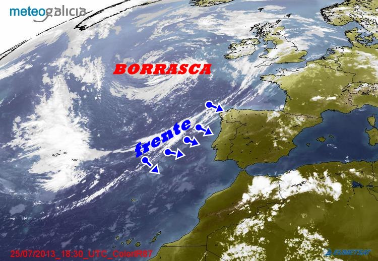 Esta borrasca tiene un frente poco activo que cruzara la península de oeste a este. Os pongo esta captura que tome ayer de la pagina de meteogalicia. Y la actualizada de masas de aire cuando son las seis de la mañana.