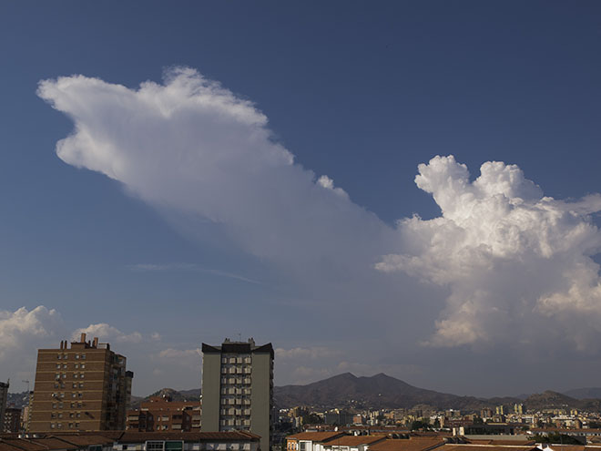 El martes no se desarrollaron cumulonimbos en los Montes de Málaga, ya que el terral lo impedía. Pero si hubo bonitos desarrollos en la provincia granadina y mas concretamente en Sierra Nevada. Esta última tormenta dejo un impresionante yunque que llego hasta Málaga.