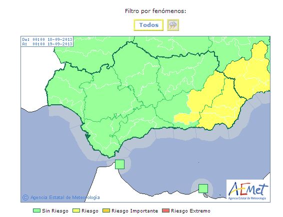 La maxima de la península se registra en Málaga Capital con 35,2 grados. Aviso amarillo por tormentas en Granada y Almería.
