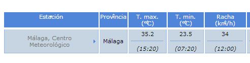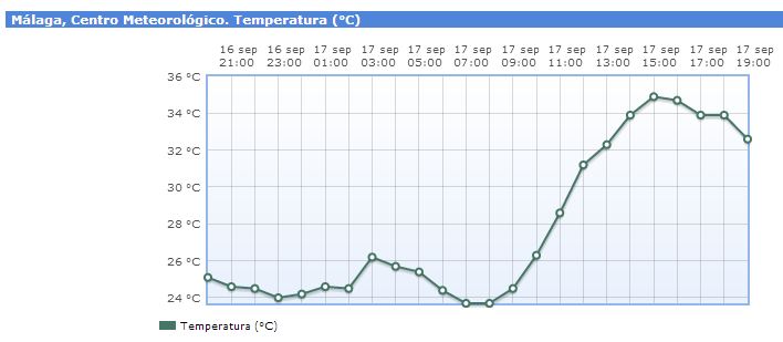 Si amigos se cumplieron los pronósticos y el terral de verano fue el protagonista ayer martes. Sobre las tres y veinte de la tarde Málaga Capital registro 35,2 grados, siendo la máxima registrada en la península.  Solo disponemos del dato del Centro Meteorológico de Teatinos, ya que tanto el puerto como el aeropuerto estaban fuera de línea. Os paso los gráficos fuente aemet.