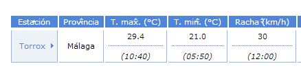 En cambio en Torrox Costa la máxima se daba a las diez 10:40 minutos de la mañana con 29,4 grados, a partir de esa hora y hasta por la tarde se mantuvo entre los 27 y 28 grados. Como todos sabéis en Torrox el poniente le entra por mar en vez de por tierra.