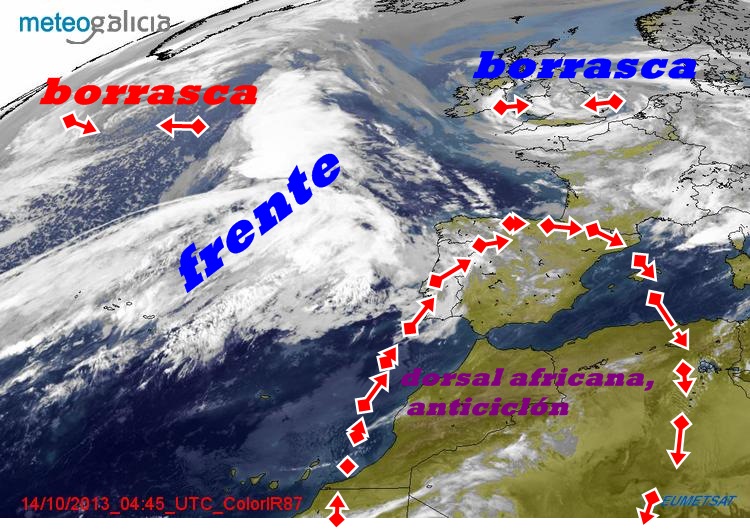 Fijaros en esta imagen del satelite Eumetsat fuente metogalicia, se puede ver como esta el Atlantico lleno de nubes y una fuerte borrasca, pero por desgracia solo afectara como he comentado antes a Galicia.