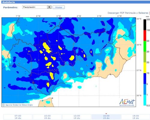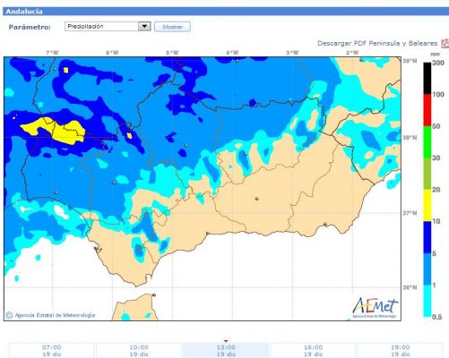 La lluvia llegara a la zona occidental andaluza al mediodía. Y a la provincia malagueña a primera hora de la tarde. La lluvia pasara rapidamente y caeran chubascos de corta duración. Os paso una secuencia del mapa de lluvias previsto para hoy