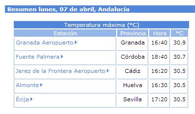 Os paso el resumen de temperaturas mas altas que se dieron en  Andalucía y en la península.  Destaca granada con casi 31 gradosFuente aemet.