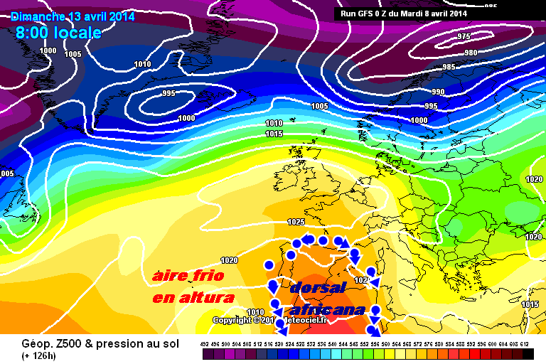 En este mapa previsto del gfs  para el Domingo de Ramos  se ve claramente como la dorsal Africana sigue siendo la protagonista, pero aun se ve un  embolsamiento de aire frío intentando entrar. Fuente meteociel.