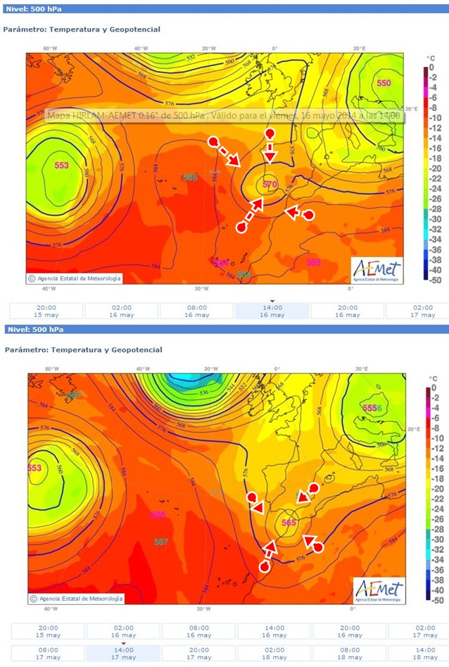 Difícil predicción para mañana y el domingo, debido a esa bolsa de aire frío que os comentaba el dia pasado. Os presento a nuestra amiga en este mapa a 500 hpa ( 5500 metros). El primer mapa es el previsto para esta tarde y el segundo el de mañana.