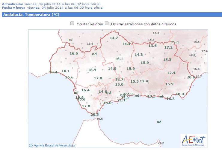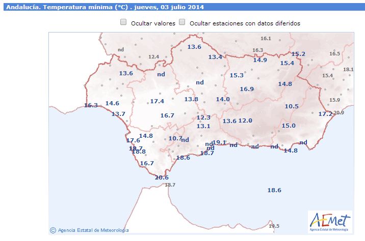 La bolsa de aire frío ya se ha reintegrado a la circulación zonal . Hoy seguirá dejando tormentas en el Pirineo y Cataluña. Esto ha hecho que los vientos giren mas al noroeste, con el consiguiente terral para Málaga Capital y zonas expuestas a este viento. La máxima rondara hoy los 32 o 34 grados, pero a medida que avance el dia el terral ira amainando. En el resto de Andalucía las máximas empezaran también a recuperarse, así como las mínimas. No espero lluvias ni fenómenos tormentosos. Os paso las mínimas que teníamos ayer jueves y las de hoy viernes. Fuente Aemet.