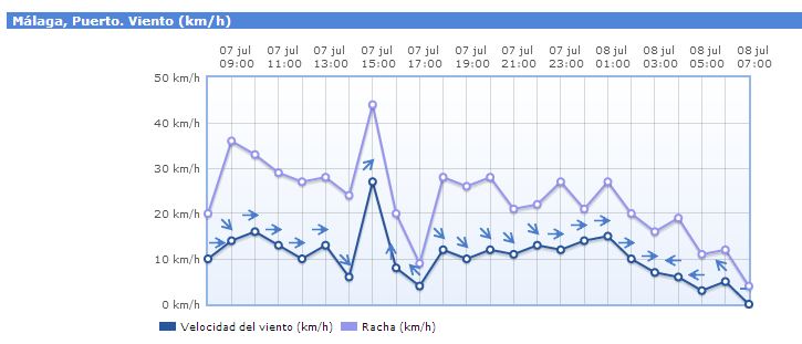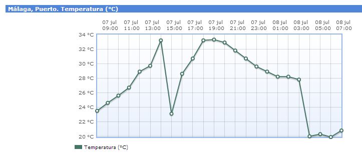 La maxima de ayer lunes en Andalucía la dio de nuevo Málaga Aeropuerto con 35.4 grados. Pero ocurrio una cosa en la estación del Puerto que yo personalmente no la había visto tan brutal como sucedió. Cuando sopla el terral en Málaga se suelen producir algunas veces rebozas de sur sureste y es algo normal, pero lo que paso ayer es impresionante. Los gráficos lo dicen todo, una bajada de temperatura de 11 grados en apenas una hora. Otra cosa curiosa fue la reboza tan bestia, ya que la racha de viento llego a los 40 kilómetros por hora. Fuente aemet.