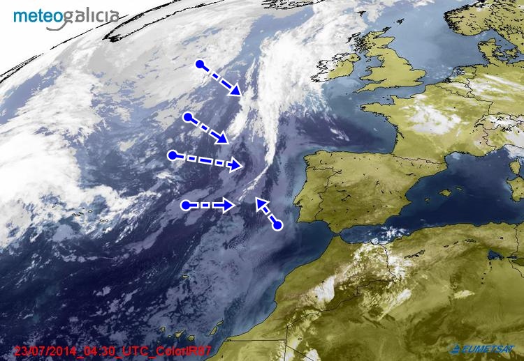 Se acerca un frente muy poco activo al noroeste peninsular acompañado de una vaguada, esto hará que los vientos que hasta hace unos dias soplaban entre sur sureste, cambien al oeste. Aquí podéis ver el frente en una imagen del satélite eumetsat fuente meteogalicia, y un mapa isobárico fuente metoficce.
