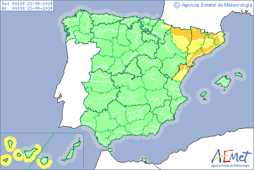 Esta vaguada dejara fuertes tormentas acompañadas de granizo en el noreste peninsular. Por este motivo la Aemet ha activado el aviso amarillo en estas zonas que veis. Fuente Aemet.