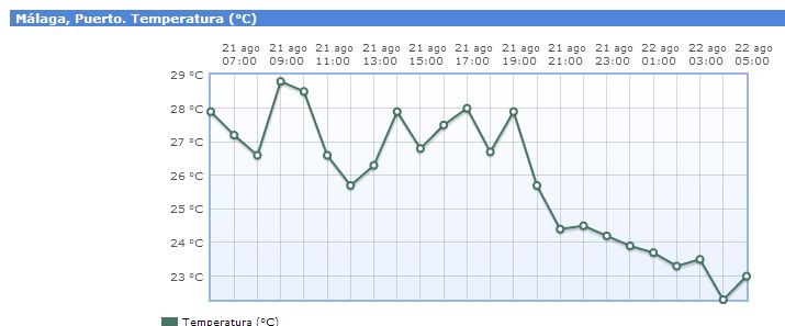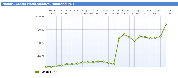 Ayer jueves se cumplieron los pronósticos, y en la zona del Puerto un poco antes del mediodía entro sur sureste, que iba acompañado de nubes bajas e incluso nieblas. A la zona de Teatinos llego un poco mas tarde , esto trajo consigo una bajada de temperaturas, ya que a esa hora el terral era el protagonista. En cambio el sur sureste disparo la humedad, y de estar al 20 %, paso casi al 80 %. Os paso unos gráficos muy significativos.