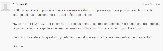 DESDE HACE TIEMPO HAY PROBLEMAS CON EL BLOG A LA HORA DE COMENTAR Y NO SOLO ESO. ESPERO QUE SE RESUELVA PRONTO. mUCHAS GRACIAS ANTONIO Y PERDÓN POR LAS MAYÚSCULAS, LO MISMO GRITANDO SE ENTERAN EN VOCENTO.