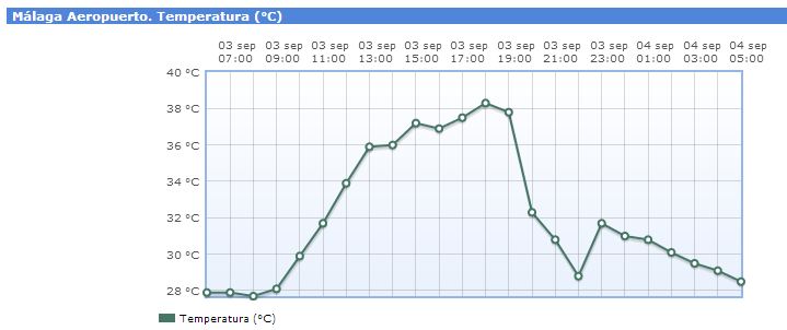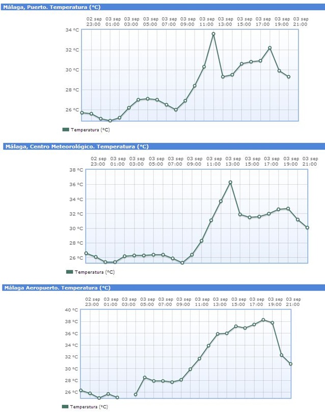 Se cumplieron los pronósticos mas o menos y el terral fue el protagonista. En el post de ayer comentaba que esperaba una reboza de sur sureste sobre las dos de la tarde, y así sucedió. Donde mas se noto fue en el Puerto, seguida del Centro Meteorológico en Teatinos, en cambio no llego al Aeropuerto. Fue en el Aeropuerto donde se registro la maxima de la Capital con 38,4 grados, seguida de Teatinos con 37,2 y los 35,1 del Puerto. Os paso los tres gráficos de las tres estaciones. Fuente Aemet.