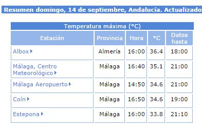 Os hago un pequeño resumen de ayer domingo. Lo primero que aunque esperaba terral, la sorpresa fue la maxima que se dio de 35 grados en Teatinos. En el Puerto y como es habitual dio menos registro, de nuevo entro una reboza de sur suroeste en vez de levante. Os paso el gráfico de temperatura del Puerto y los datos mas destacados de Andalucía.