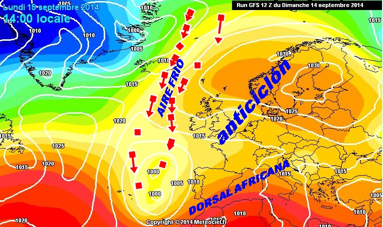 El anticiclón que domina Las Islas Británicas y buena parte de Europa, junto a la dorsal Africana no la dejan pasar. Hasta aqui se entiende verdad ?, pero lo normal es que durase un par de dias y al final se desgastase. Pero no es así amigos, por la zona norte de la borrasca le entra de vez en cuando aire frío inestable, esto hace que de nuevo coja fuerza y baje su presión. En dos palabras amigos de la meteo, desde la latitudes muy altas le llega combustible para seguir viva.