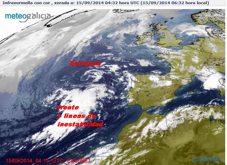 Esta borrasca y como comentaba ayer se acerca un poco mas al oeste de Portugal, ademas se refuerza bajando su presión. Las lineas de inestabilidad o frentes afectaran mayormente al tercio mas occidental, ya que la puñetera dorsal africana frena su avance. En esta imagen del satelite Eumetsat se ve claramente.