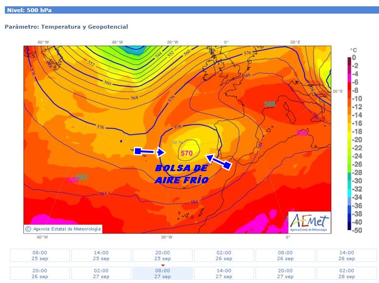 Sobre los posibles cambios que se puedan dar este próximo fin de semana “EN FORMA DE LLUVIAS”, lo veremos con mas seguridad mañana viernes. Una nueva bolsa de aire frío nos afectara, lo bueno en esta ocasión es que los vientos en el Litoral Mediterráneo entrarían de sureste y no aterralados como paso el domingo pasado, ademas nuestra querida dorsal Africana desapareceria. De todas formas no me quiero hacer ilusiones, ya que como todos sabéis estas situaciones son muy difíciles de modelizar. Os paso un mapa previsto a 500 hpa ( 5500 ). Mañana seguimos la evolución amigos.