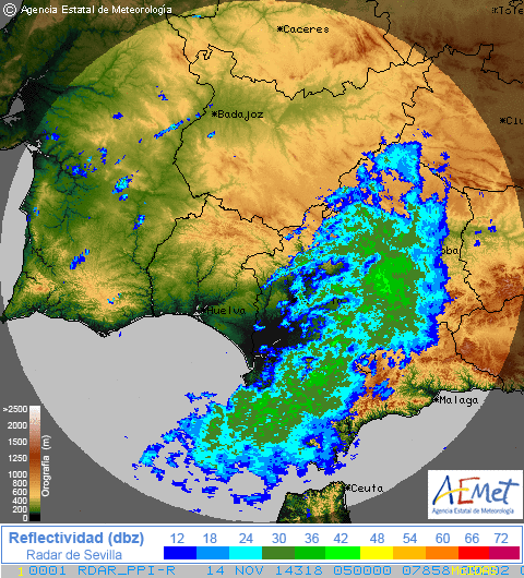 Buenos días amigos de la meteo, son las seis de la mañana, registro 18.4 grados y los cielos andaluces están muy nubosos. La lluvia ya es protagonista en la zona occidental e interior de Málaga. El grueso del frente se encuantra ahora mismo entre la provincia de Sevilla, Cádiz y zona occidental de Málaga. Os paso el radar de lluvias, fuente aemet