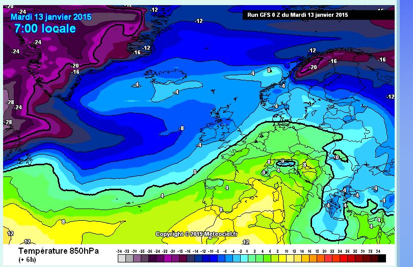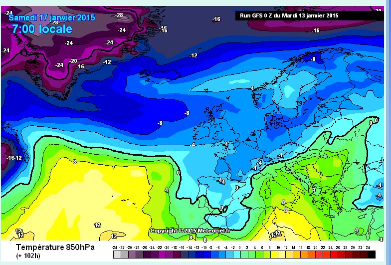 Mañana que libro y con mas tiempo os explicare el cambio de tiempo que tendrá Andalucía y toda la península, os comunico que el frío, la lluvia  y el viento tomaran protagonismo el viernes y el próximo fin de semana. Os paso estos dos mapas de temperatura a 850 hpa ( 1500 m) , el primero es de hoy y el segundo el previsto para el sábado.
