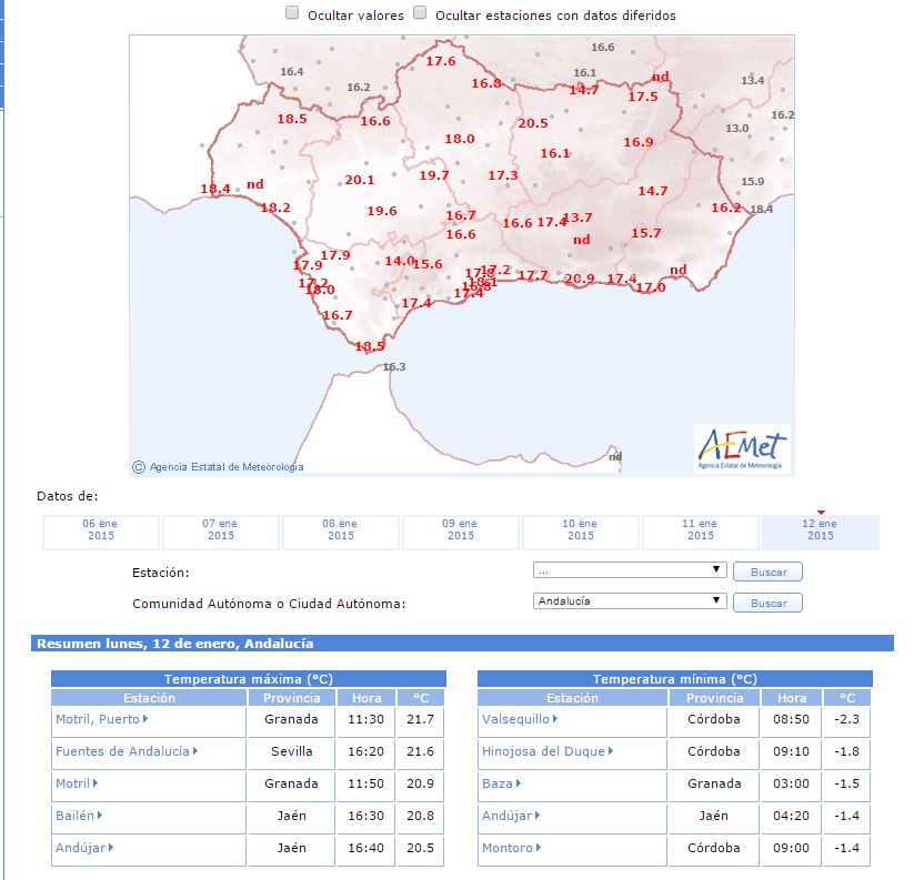 Destacar que en estos momentos no hiela ni en Granada y Baza,  las mínimas en Andalucía son altas para las fechas que estamos. Las nubes no han dejado escapar el calor acumulado de ayer.  El viento soplara flojo y de dirección variable, las máximas en el interior oriental de Andalucía y Valle del Guadalquivir se acercaran a los 20 grados. En Málaga Capital casi llegaremos a los 20 también.